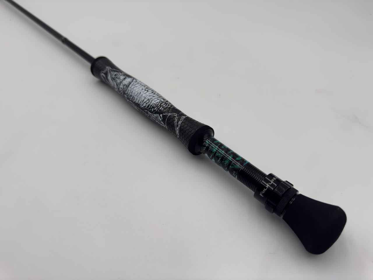 Aesthetically, the rod boasts a sleek, blacked-out styling featuring our proprietary polyurethane-blend handles. Wrapped in custom artwork from Ed Anderson, these grips are built for comfort and performance during extended use in harsh environments. The anodized aluminum reel seat with a vibrant design not only adds a touch of style but also ensures durability and corrosion resistance; perfect for both freshwater and saltwater environments.